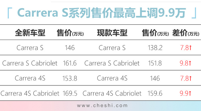 保时捷全新911在去年11月28日全球首发并同步开启预售,新车搭载3.0T+8DCT(现款为7DCT)动力系统,其中Carrera 4S百公里加速仅需3.6秒,相比老款提升0.4秒。网上车市从保时捷官方获悉,保时捷全新911将于10月11日正式上市,新车目前已经公布了Carrera S系列4款车型的官方售价,为146万元-169.5万元,更加入门的Carrera系列4款车型的官方售价将在当天公布。