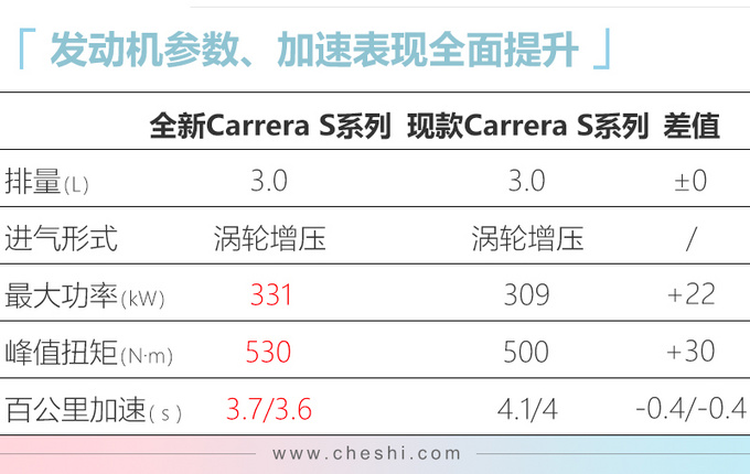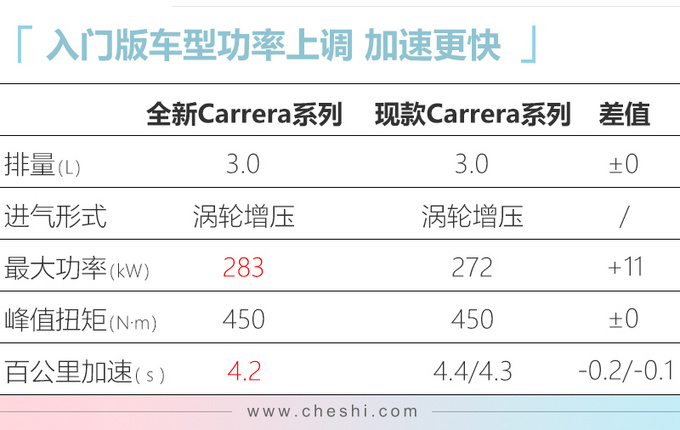 动力方面,全新911取消了自然吸气发动机,Carrera、Carrera S系列车型均搭载3.0T水平对置六缸发动机,传动系统均匹配全新开发的PDK 8速双离合变速箱。其中Carrera敞篷版系列百公里加速时间均为4.4秒,相比现款分别提升0.2秒、0.1秒;Carrera S敞篷版系列百公里加速时间分别为3.8秒、3.9秒,相比现款分别提升0.5秒、0.3秒,值得一提的是在选装Sport Chrono组件后,每款车型的加速时间可再提升0.2秒。