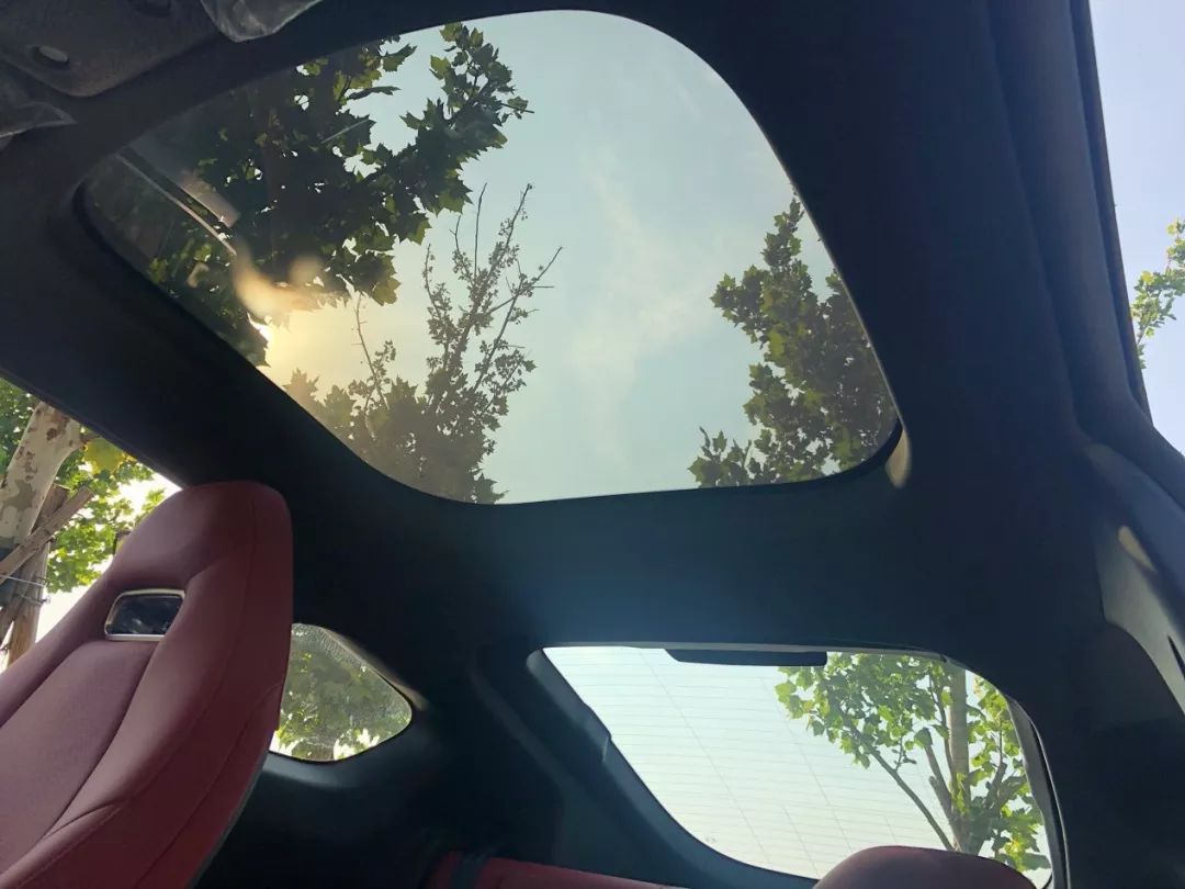 天窗尺寸并不小,后排也能很直接地看到天空的金色,透光性没的说,但如果赶上大夏天,也比较晒。