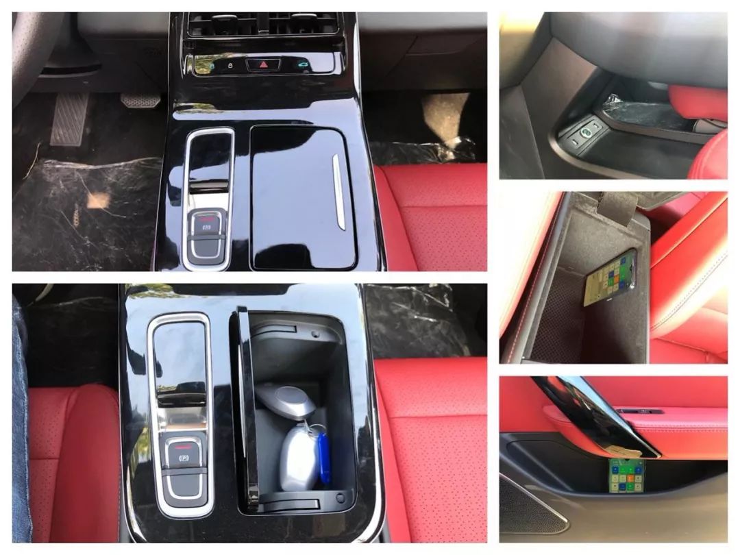 中控屏下方四个按键:分别为车门开关键,危险报警闪光灯及后备解锁键,中控台下方是2个USB和12V点烟器接口,这里的空间可以放一个小跨包。中央扶手箱内竟然有一个小暗格,后面二个杯架,基本够用。