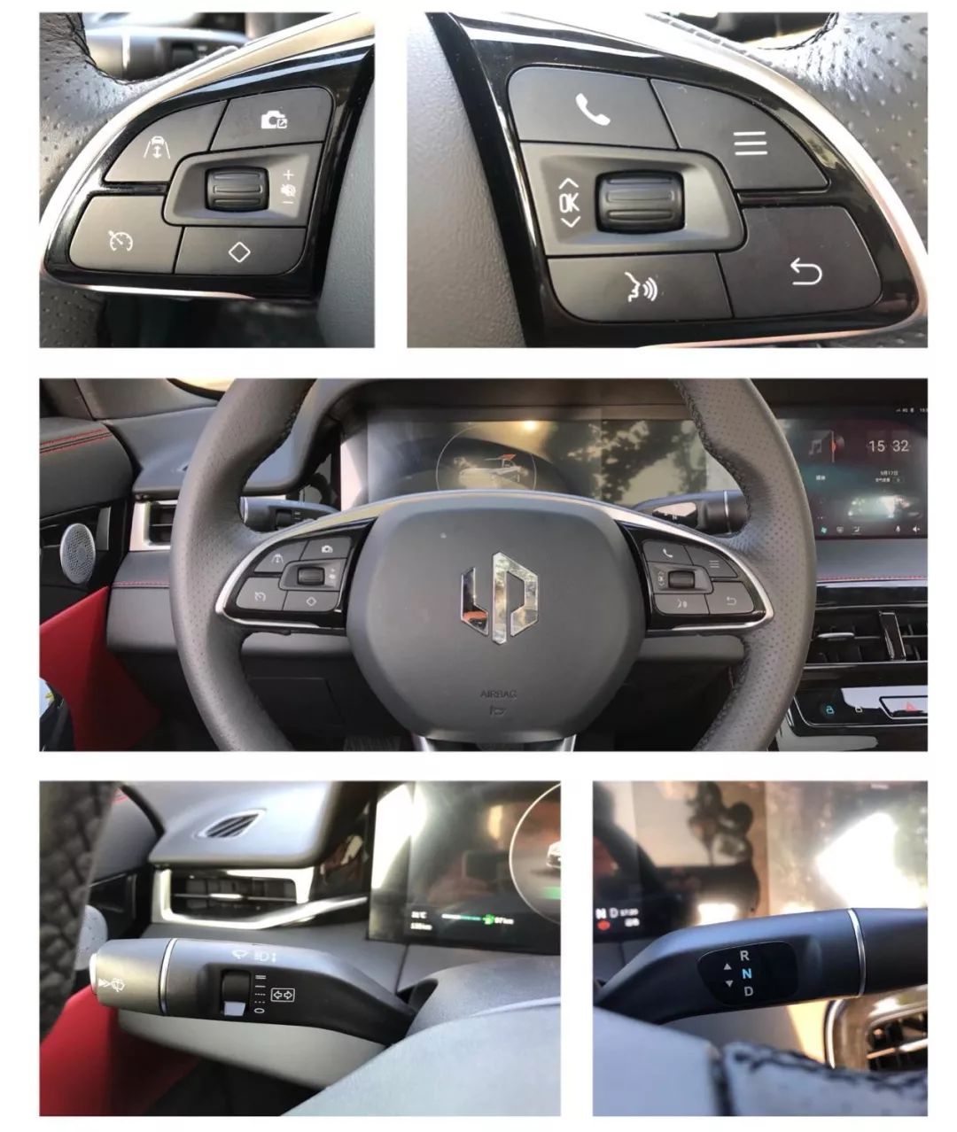 比较有意思的当属怀档设计,有点奔驰的味道,方向盘支持手动前后上下调节,左侧定速巡航摄像头拍照等按扭,ACC自适应巡航要在下次OTA升级后才能使用。