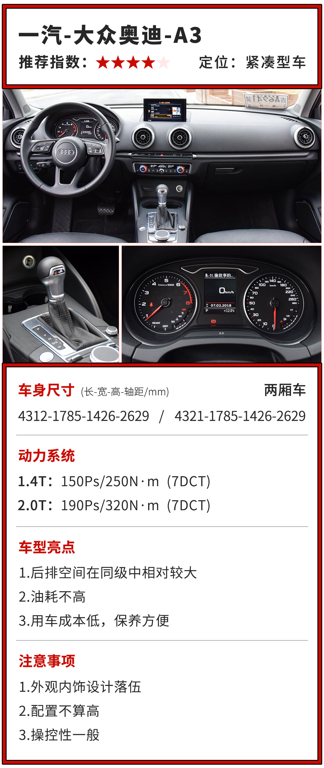 奥迪A3虽然在整车质感上做到了一个豪华品牌该有的表现,但需要注意的是,这一代车型推出已有一定的年头,设计与对手相比显得十分落伍。而A3的低配款型在配置上做得也不够好,连倒车影像和皮质座椅都没有标配,万一有亲朋好友蹭车问起为啥没这个没那个的事儿,还是比较尴尬的。