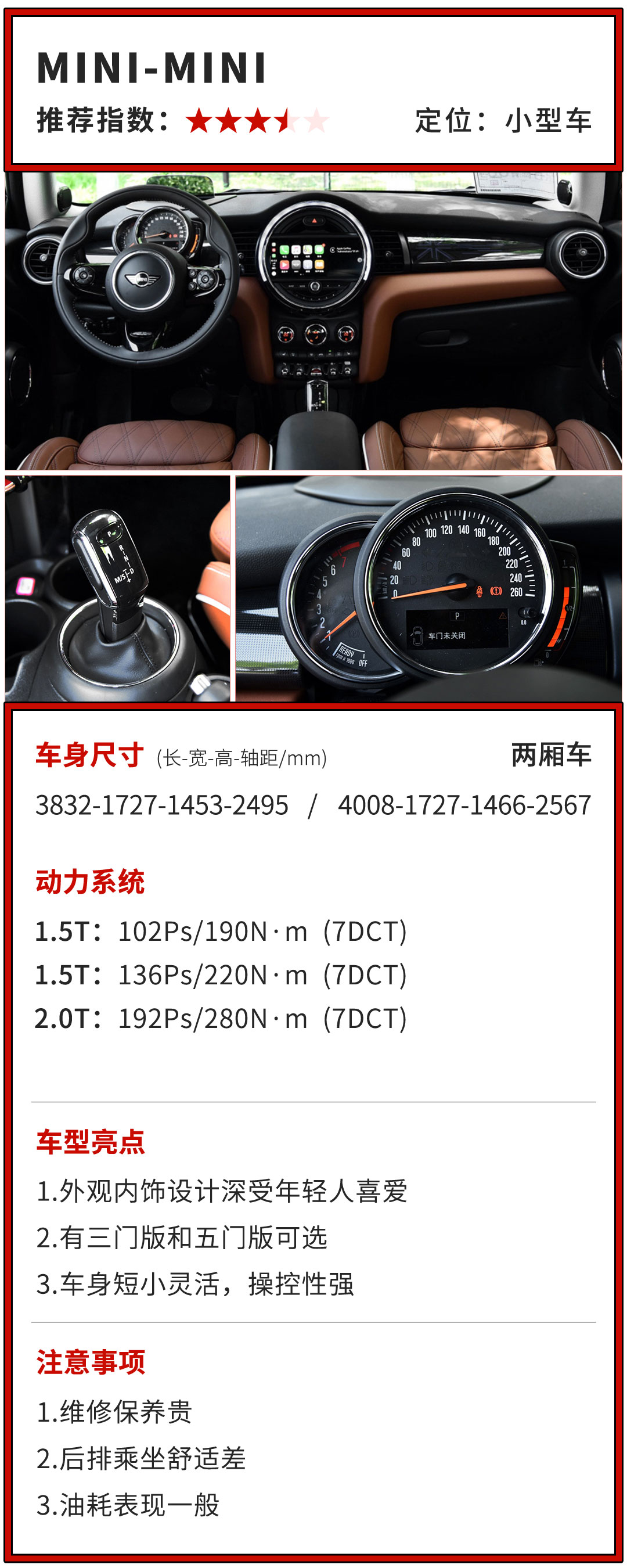 MINI主要是为那些不差钱,同时又个性十足的两厢车迷们准备的。它整车设计看起来虽然足够可爱,好像是专门为女性消费者量身定制一样,但实际上却是一台不折不扣的驾驶利器,短小的车身配上动力强劲的引擎,使得MINI的推重比很高,中低速段推背感强烈,配之以很小的转向比,让MINI的驾驶感受就犹如大号的卡丁车。当然,如果你不喜欢三门版,那么还有稍微“实用”的五门版可以选择。