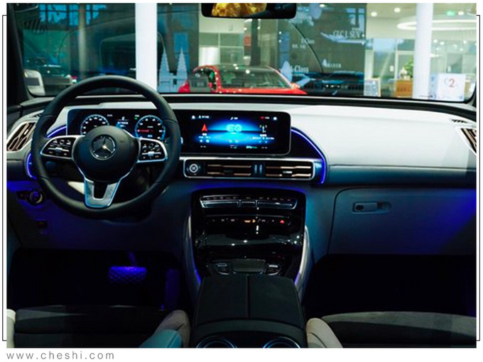 奔驰EQC提供两种前脸造型,主要差异在格栅的装饰上,一种为多横幅+格栅风格,另一种为更为动感的双横幅+亮黑色涂装风格。大灯组内部结构采用纵置排列,集成“C”字型日间行车灯。内饰方面,EQC配备标志性的双10.25英寸显示屏和带有双拇指控制系统的方向盘,同时加入蓝色氛围灯进行点缀。