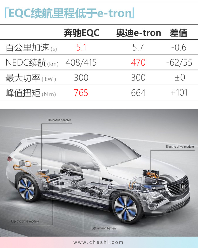 尺寸方面,奔驰国产EQC较海外版EQC略有调整,长度、宽度分别加长13mm、39mm,轴距均为2873mm。动力方面,新车采用前后双电机的布局,系统最大功率300kW,峰值扭矩760N·m的电动机,0-100km/h加速时间为5.1s。续航方面,EQC搭载能量密度为125Wh/kg的三元锂电池组,该能量密度低于市场上主流的中高端电动车,其NEDC工况下续航里程为408/415km。