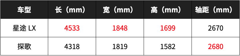 首先让我们来对比一下星途LX和探歌的车身尺寸。