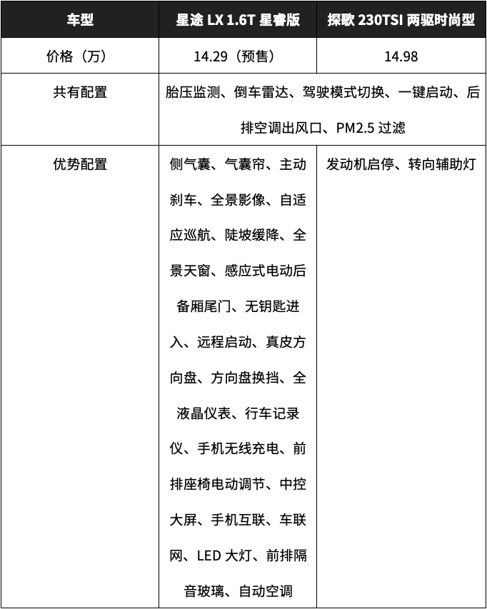 由于星途LX目前还未上市,因此配置对比部分我们选取星途LX预售价与探歌指导价相近的两款配置车型作对比,详见下表: