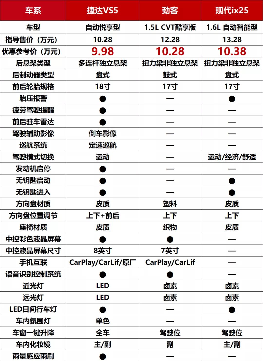 如果是中年人选车,价格可能是影响其购车非常重要的一个前提条件,只要价格低,哪怕小轮毂、布座椅、没天窗、没大屏、卤素灯都行。但是年轻人可不甘心做“老古董”,配置是怎么有面儿怎么来。10万元预算,捷达VS5、劲客和ix25谁的配置更丰富呢?