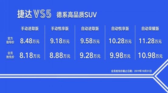 捷达VS5 (配置|询价)——大众品牌子品牌捷达品牌推出的旗下首款紧凑型SUV,官方指导价8.48-10.98万元,会员抢先价仅8.18 -10.98万元,价格比定位更低一级的合资品牌小型SUV劲客、ix25还要亲民,强势入驻十万级SUV市场。