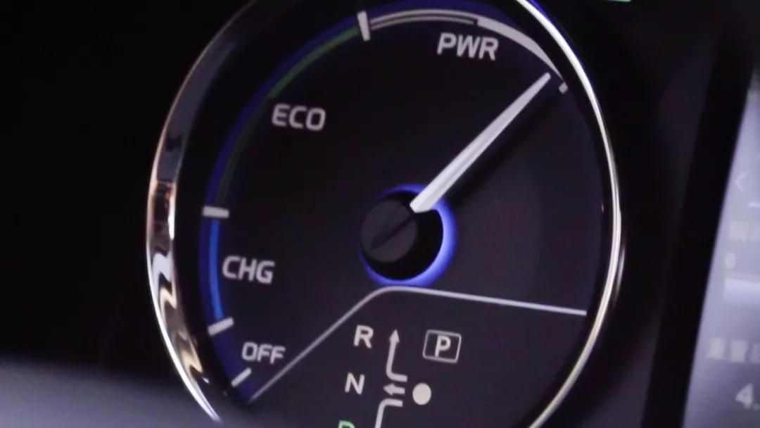 还有就是仪表盘的界面设计,一般燃油车启动之后都会有怠速转速,但是因为这是插电混合动力车型,车辆静止的时候燃油发动机、驱动电动机都停止运转,所以并没有转速显示,指针指示的是动力系统当前处于CHG/ECO/PWR三种工况的哪个区域。