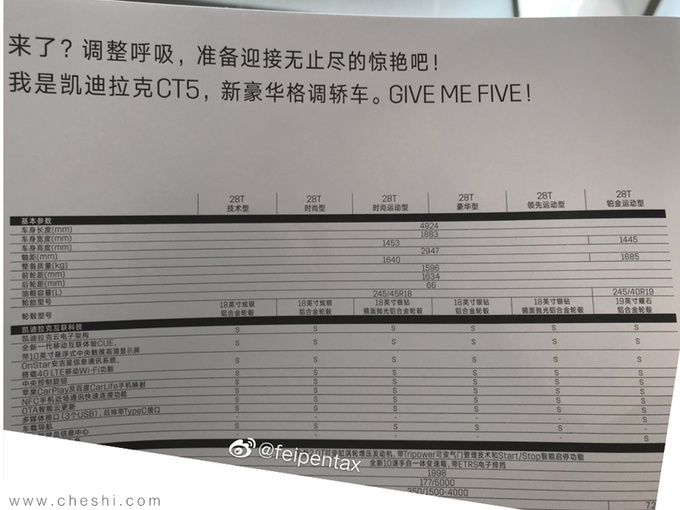 凯迪拉克CT5 (配置|询价)已经公布了28-34万元的预售价格区间,将于10月20日正式上市。网上车市获得了CT5具体配置信息,将推出6款车型。新车全系搭载2.0T发动机匹配10速手自一体变速箱,均为后驱车型,顶配车型配有机械托森式后桥差速器。