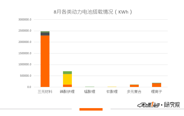 8月三元材料的搭载量为2.47GWh,其中乘用车占93.2%,三元材料搭载量占总搭载量的71.1%,与7月相比增加了30个百分点。磷酸铁锂电池由于客车产量大幅下滑,装机量从7月的2.45GWh跌至0.71GWh,在月度装机中的占比也回落至20.5%。锰酸锂、钛酸锂以及多元复合电池8月合计装机116.2MWh,占比3.4%。