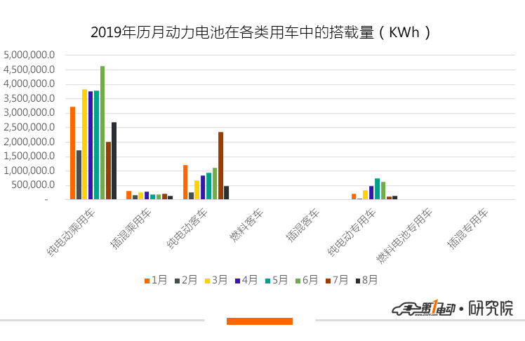 从车辆细分类别来看,2019年8月电动汽车装机量主要来源于纯电动乘用车,纯电动客车装机量下跌幅度十分巨大。