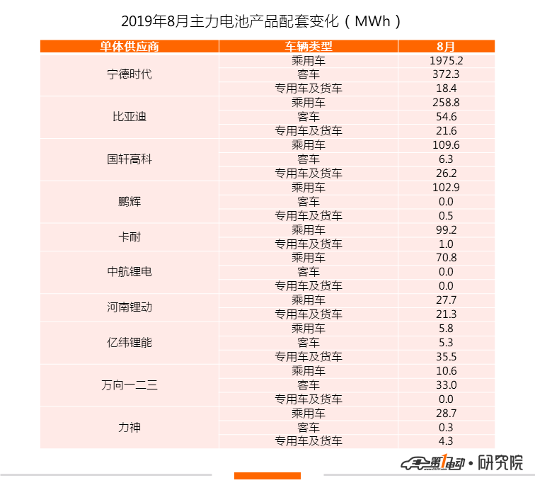 8月宁德时代在乘用车上的装机量为1.98GWh,主要配套车企为北汽新能源、广汽乘用车、蔚来和吉利等。由于配套北汽EU5、AION S (配置|询价)、蔚来ES6和帝豪 (配置|询价)EV等热门车型,随着这些车型产量的提升,宁德时代的装机量也水涨船高,使用电池基本为三元材料电池。客车方面8月装机量为372.3MWh,较7月下跌81.1%,主要配套车企为宇通汽车,使用电池均为磷酸铁锂电池。