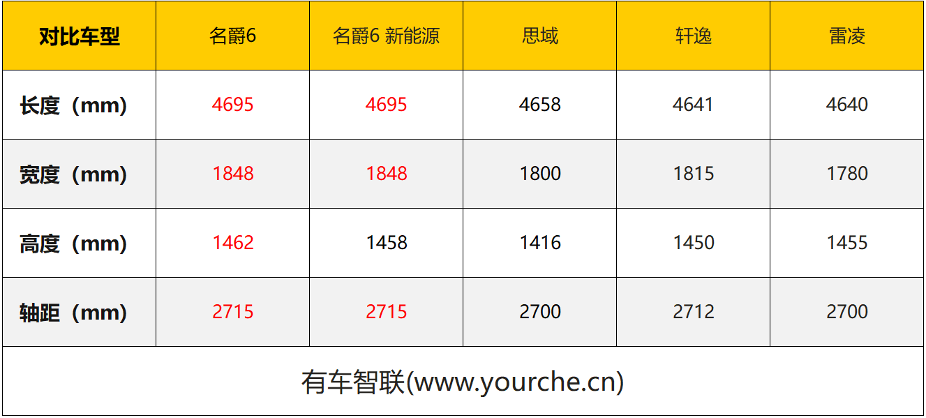 对于不好评判结果的外观而言,空间对于家轿车型来说还是相当重要的,毕竟宽敞的乘坐空间,带着家人驾车出行,别有一番惬意的享受。首先我们根据官方数据进行了车身尺寸的对比,通过数据可以看出无论是车身的长宽高,或者是轴距来说,名爵6均要大于其他三款日系车型。