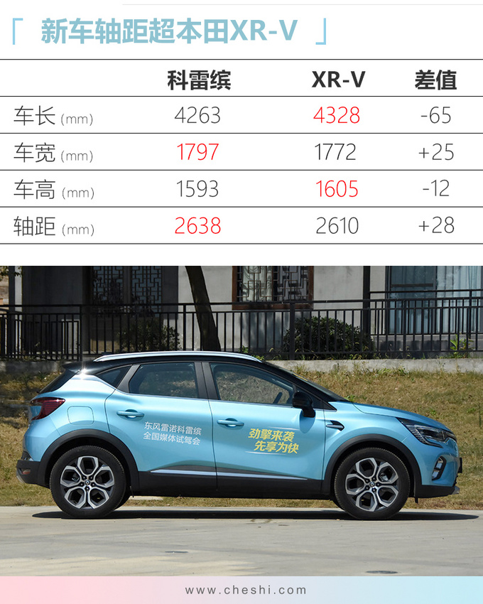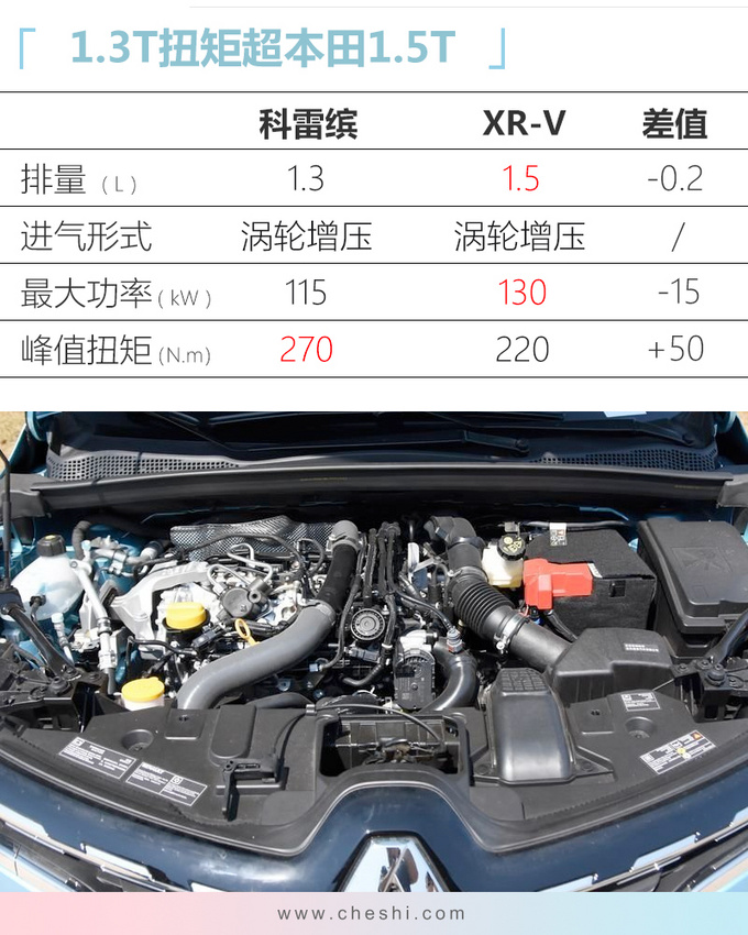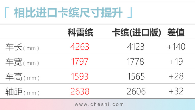 科雷缤相比进口版卡缤车型在尺寸上进行了加长,相比同级别竞品本田XR-V (配置|询价)在轴距方面占据优势。动力方面新车将搭载雷诺与戴姆勒共同开发的1.3T四缸发动机,目前奔驰A级已经搭载。配于科雷缤车型上的1.3T发动机最大功率115kW,峰值扭矩270N.m,匹配7速湿式双离合变速箱,官方0-100km/h加速时间为8.7秒。