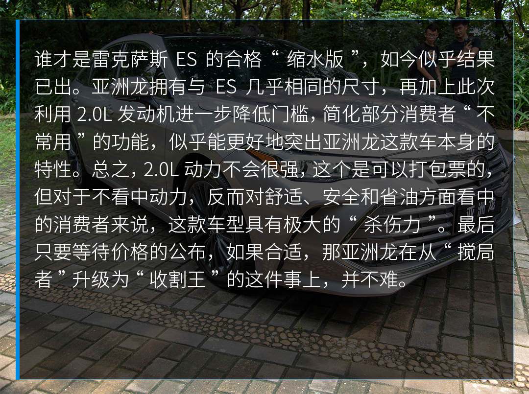 亚洲龙 (配置|询价)从今年3月上市至今已经有6个多月的时间,在这段时间里,亚洲龙的销量一直表现都不错,每月6千辆左右的水平让亚洲龙打成功破了越级中型车通常卖不好的魔咒。不过一汽丰田依然不太满意这个销量数字,决定展现自家的“精准刀法”,推出2.0L车型,并且这次把专注点主要集中在舒适、安全和省油这些中型车的痛点上。