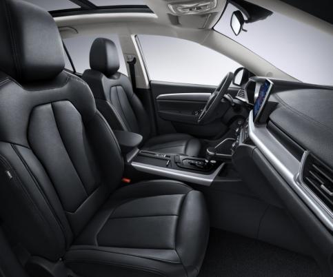 前脸展翅式进气格栅搭配鹰眼式晶钻双透镜一体式LED大灯,浑然一体、相得益彰,既提升了辨识度,又兼具实用性,照射距离可达200米以上。炮筒式超大尺寸雾灯,结合周围波浪式线条设计,深邃而充满力量感,具有智能随向辅助照明功能。18寸金属切削双色铝合金轮毂,配合从叶子板到D柱上扬的车侧腰线,使整车具有鹰击俯冲的动势。