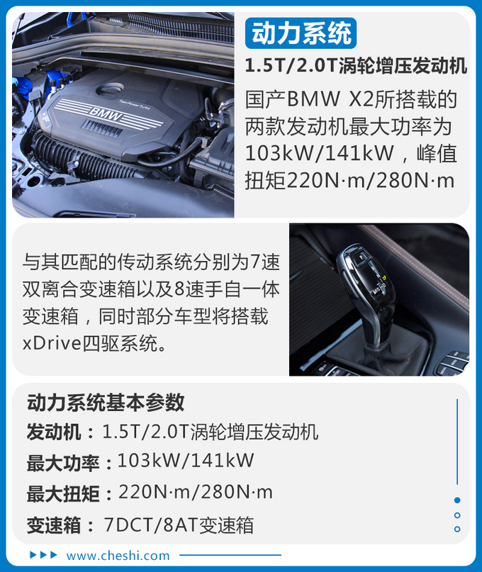 BMW X2在进口时期,一直将自己定位于SAC,即“高性能运动型多功能车”,其优秀的操控性能和良好的通过性一直被广大宝马迷们大为赞赏。区别于BMW X1 (配置|询价)突出家用空间日常用车,BMW X2更像是一位公路骑士为自己买单的一个大玩具。而此次圆圆姐有幸在天津试驾国产BMW X2,全车与进口版本高度一致,在动力方面,继续使用20i(1.5T)和25i(2.0T)进行区分。今天圆圆姐带大家试驾的就是国产BMW X2中最受市场关注的25i车型,其搭载一台最大功率141kW,最大扭矩280N·m的全新升级2.0T B48发动机,匹配的是爱信8AT变速箱,配备四驱系统。