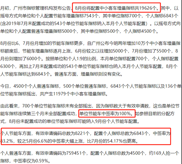 8月份比6、7月份月增加的节能车指标更多,自广州公布今明两年增加10万个中小客车增量指标额度后,节能车增量指标逐月上涨,6月份较之以往增加5000个,7月份增加了5500个,8月份则增加了6000个。4500个个人普通车指标,500个单位普通车指标,6843个个人节能车指标以及136个单位节能车指标摇出,共产生11979个中小客车增量指标。以下图片均来自广州本地宝: