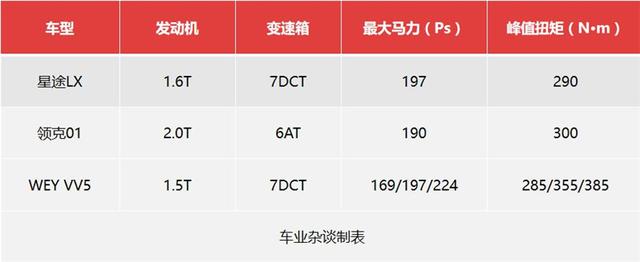 同比领克01和WEY VV5,比1.5T排量差不多,却动力更强劲,比2.0T动力不差,有排量和油耗的优势,星途LX这套动力组合的运用可以说非常讨巧。