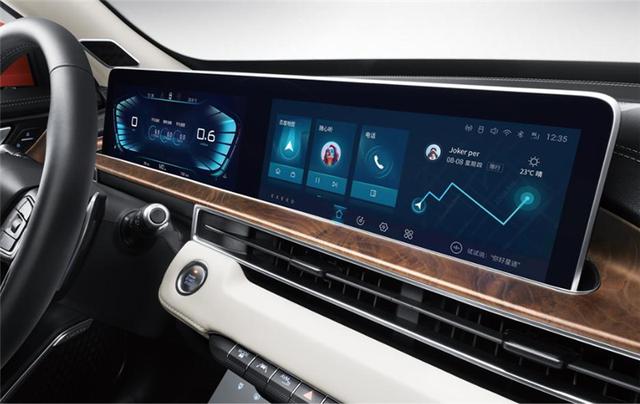 新车内饰采用环抱式座舱设计,双12.3英寸显示屏配以触控式液晶空调控制面板,双连屏横向设计显得档次很高,再加上触摸手势控制板,钢琴黑面板,科技感十足。门板上有皮质和木纹饰板,以及液晶七色氛围灯,烘托出非常不错的豪华氛围。总体而言,新车内外设计足够出彩,当得起国产高端车型的名头。