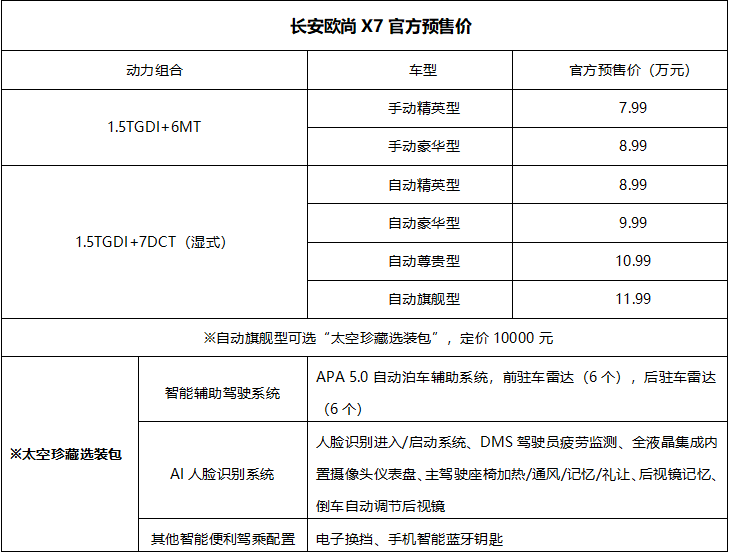 最早于9月27日,长安欧尚汽车正式公布其旗下“大美都市精品SUV”——长安欧尚X7的车型配置,并成功引起许多用户的青睐。国庆假期后的第一个工作日,终于正式公布新车推出手动挡和自动挡共6款车型,预售价格区间为7.99万元~11.99万元,现已正式开启预售。