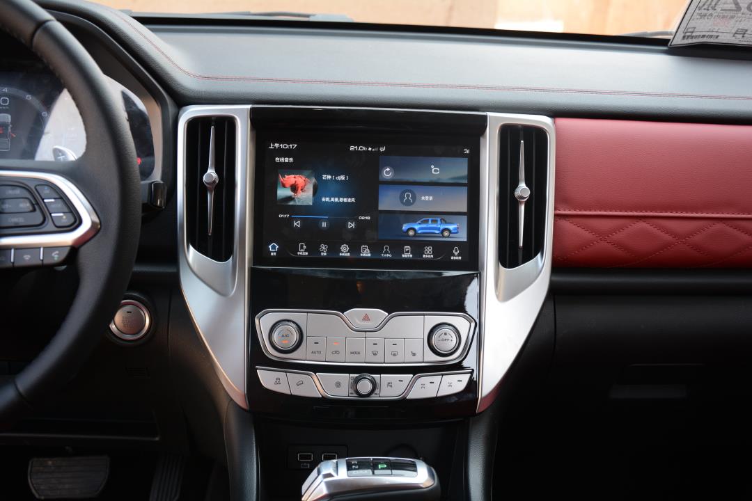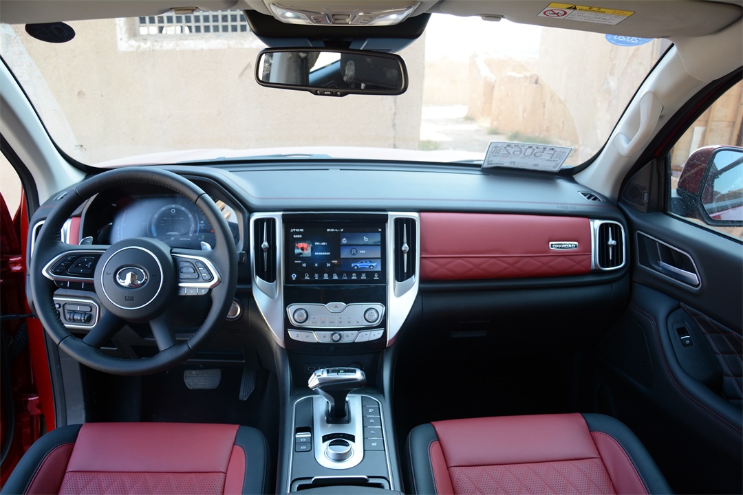 与众多普通皮卡不一样的是,长城炮的内饰豪华与科技感并存。内饰整体设计比较“中正”,T型区域都是对称式,加上红色皮质包裹,给人一种很舒服的视觉感受,高级感非常强;多功能方向盘、9英寸中控显示屏、7英寸液晶仪表盘以及一些实体的按键搭配起来,使得整个中控区域科技感非常明显。