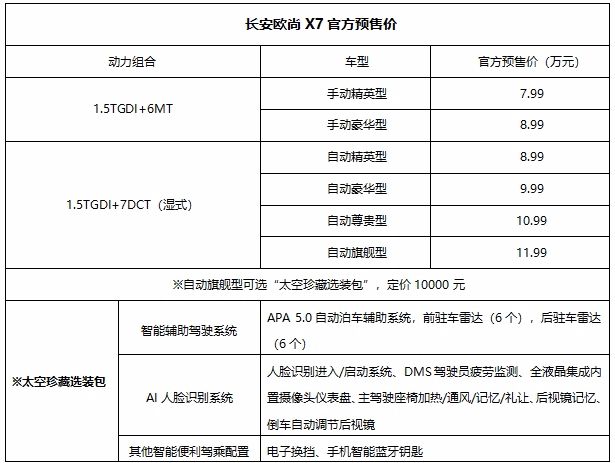 预售价仅为7.99万元-11.99万元的长安欧尚X7,不仅在节约养车成本方面走在了其它品牌的前面。而且,空间、品质、动力、颜值、智能配置等方面表现也非常的卓越。全系标配1.5TGDI发动机、双底盘软连接设计、车身电子稳定系统、电子驻车、LED大灯、悬浮式彩色触控大屏,如此超高的性价比,相信它的出现会给10万级的SUV市场带来不小的冲击。面对长安欧尚X7诸多的亮点,实在让人想不出拒绝它的理由,如果大家正想入手新车,长安欧尚X7绝对值得选择!