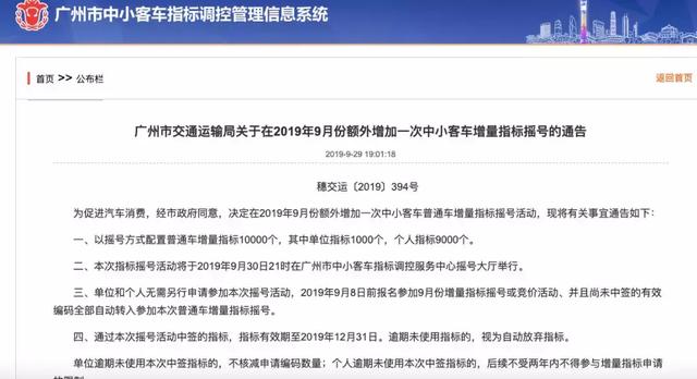 另外,为促进汽车消费,广州还特别在9月30日,以摇号方式配置普通车增量指标1万个,其中个人指标9000个。不过,此次摇号活动中签的指标有效期截止至2019年12月31日,市民需在此日期前使用摇号指标。国庆黄金周前进行此操作,在第四季度挽救广州车市的决心也是十分明显了。
