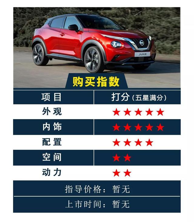 大咖点评:上一代的日产JUKE个人认为真的是很丑,太过于个性!不过全新日产JUKE好看多了,甚至有点电影里飞船的感觉。前脸依然延续了现款车型的布局,但在V-motion 2.0设计语言下显得更加和谐和科技感。车尾造型则有点低调,应该再炸裂一点。新车的长宽高为4210/1800/1595mm,内部空间比上一代车型有所提升,整备质量相比上代车型小幅降低了23kg。