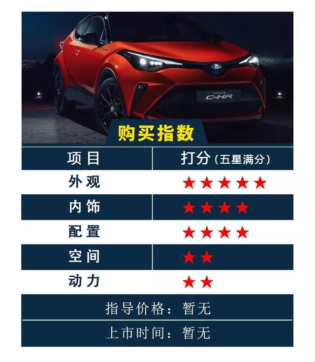 大咖点评:丰田前不久在海外发布了新款C-HR车型,估计国产版明年也会上市新款,所以可以先过一下眼瘾。新款C-HR采用了全新的的前后保险杠,看起来会更加有竞技风格,标配LED大灯,提供17英寸和18英寸的轮圈。另外,在现有车型上增加了红色和橙色装饰,黑色配银色车顶的风格也是首次出现。