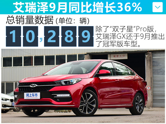 另一款SUV车型——瑞虎5x (配置|询价)也深受消费者喜爱,9月销量达7,584辆,同比增长96%,环比增长20%。经过升级以后的瑞虎5x Hero版,起售价下调6千元,进一步降低购车“门槛儿”,同时累计有26项配置优化升级,可谓是“降价增配”,性价比显著提升。另外,这款车还新增双色车身颜色,造型更加时尚。据了解,这款车还将在本月迎来1.5T高能版车型,针对动力、底盘、配置进行了大幅升级,疑似售价为8.99万。
