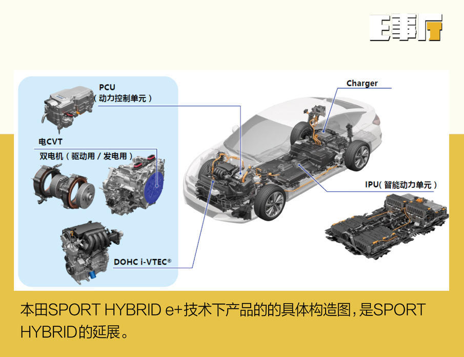 我们可以简单理解成:SPORT HYBRID e+(插电混动技术)是基于本田自主研发的双电机混合动力系统i-MMD的SPORT HYBRID(混合动力)技术的延展。因为双方具有相当高的共通性:发动机舱布局相同,在传统燃油车变速器的位置搭载电动CVT,电动CVT配置了两台电机以及控制这两个电机的PCU(动力控制单元)。那么二者的区别又是什么呢?