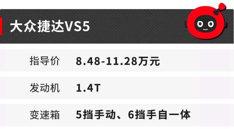 编辑点评:还是大众,不过是大众全新的入门品牌大众捷达,走入门路线的捷达品牌旗下的VS5 (配置|询价)性价比绝对能让大伙满意,动力方面,不到10万元的起步价便搭载1.4T发动机让许多大众系的车主嫉妒。设计方面,整体风格还是大伙熟悉的大众风格,但颇具辨识度的前脸设计还是能一眼在车海当中认出它来。内饰方面,虽然有不少大众车型内饰设计影子,但总体来说还是有不少新意,另外,VS5全系标配LED光源大灯、定速巡航、发动机启停等配置,如果你预算不多,想买一辆大众系SUV,不妨看看VS5吧。