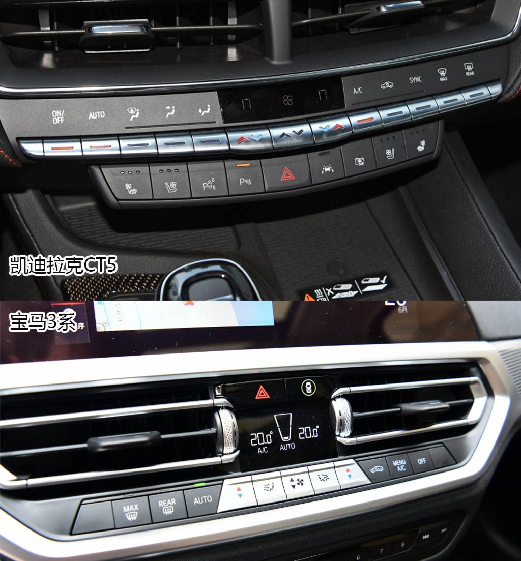 两车均采用三辐式真皮打孔方向盘,3系造型更为简洁一些,如果你喜欢镀铬装饰,那么CT5更适合你。