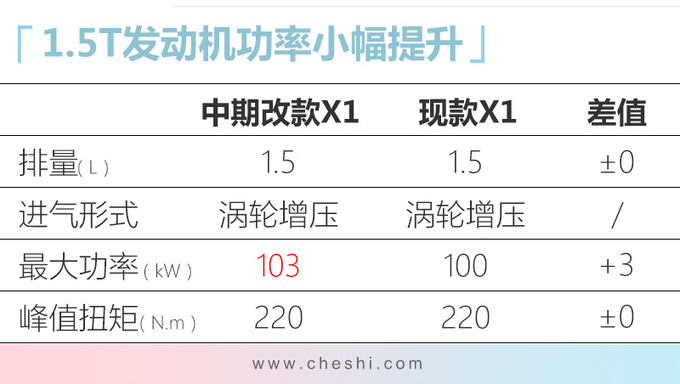 中期改款X1仅在车身高度降低了4mm(插混版保持不变),整体尺寸依然领先奥迪Q3 (配置|询价)、奔驰GLA (配置|询价)。动力方面,新车继续搭载1.5T、2.0T发动机,传动系统燃油版两驱车型换装7速双离合变速箱,低速行驶平顺度方面将会受到一定影响,插混版、四驱版的6T/8AT变速箱则保持不变。