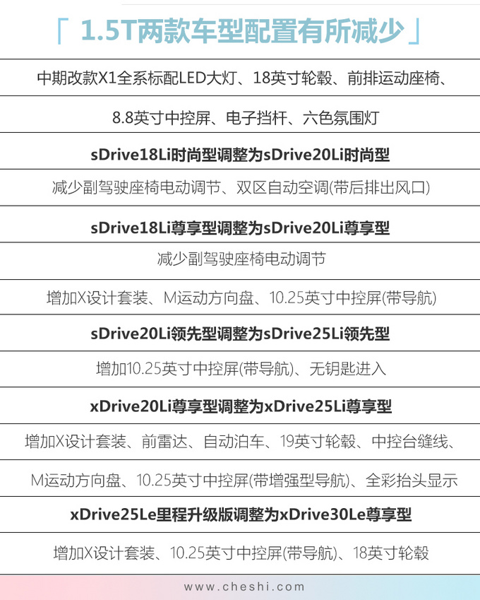 与现款车型相比,宝马中期改款X1将车型数量从5款减至4款,取消了xDrive 20Li豪华型,并对车型进行了重新命名。新车对全系标配进行了升级,包括LED大灯、18英寸轮毂、前排皮质运动座椅、8.8英寸中控屏、电子挡杆以及六色氛围灯,不过1.5T入门版车型减少了副驾驶座椅电动调节和自动空调,1.5T高配车型同样减少了副驾驶座椅电动调节。