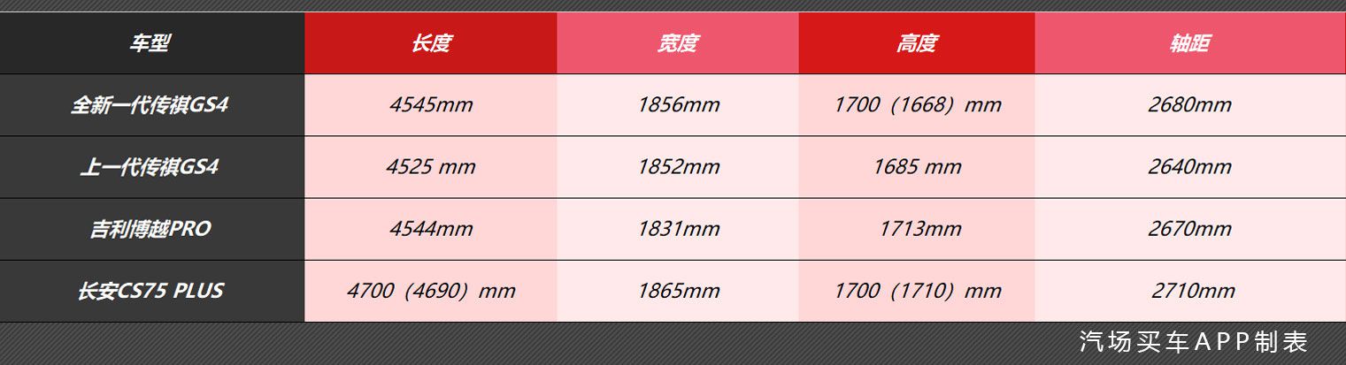 客观来讲,在博越 (配置|询价)和长安CS75分别带来PRO车型和PLUS车型后,全新一代传祺GS4的车身尺寸在同级别中并不算出彩,但必须看到,这已经是全新一代传祺GS4很大的诚意了,因为在它的上面还有传祺GS5,后者长宽高分别为4695/1885/1700mm,轴距2710mm,全新一代传祺GS4能做到如此非常不容易。