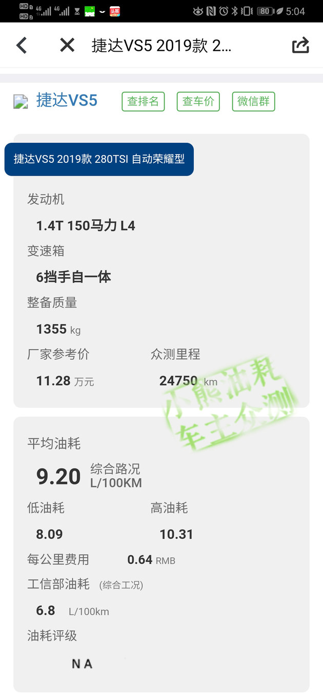 来看看这台捷达VS5的油耗表现如何吧,大值子通过小熊油耗APP了解到,目前有3307位车友给到的平均油耗是8.39L/100km,捷达VS5能有如此好的油耗表现,完全得力于它的这套1.4T加6AT的动力系统,而且只需加注92号汽油即可,所以燃油费用会相对降低一些。我们以每年行驶2万公里、使用92号汽油(6.74元/L)一年油费总开支为12402元,每个月1034元,每公里0.62元。