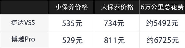 我们以捷达VS5为例,一般首次保养均为免费,小保养大约花费535元左右,一般每隔20000公里就需要进行大保养,大保养是在小保养的基础上增加部分项目(空调滤芯、汽油滤芯、火花塞)具体以4S店为准,费用基本在734元左右,而 6万公里常规保养总花费大约为5492元,相比于博越Pro的6725元相比还是相差不少的,在保养价格环节大值子认为捷达VS5更值一些。