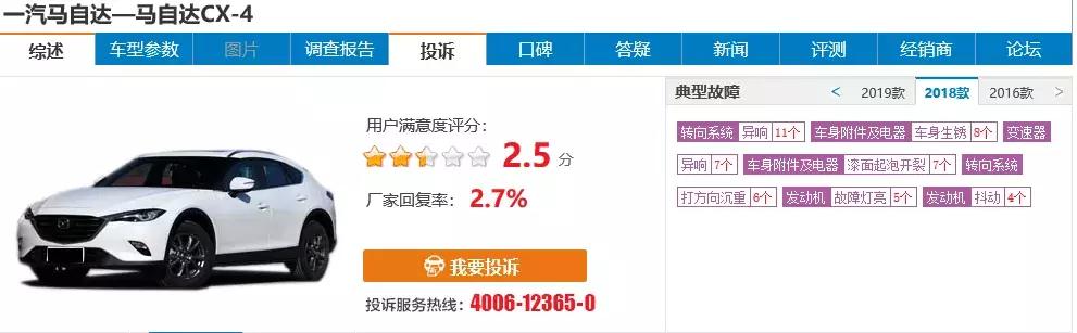 而且不仅阿特兹转向系统相关投诉依旧持续增长,一汽马自达旗下另一款重要产品CX-4也出现近20宗相关投诉,尤其在2019上半年更为明显。