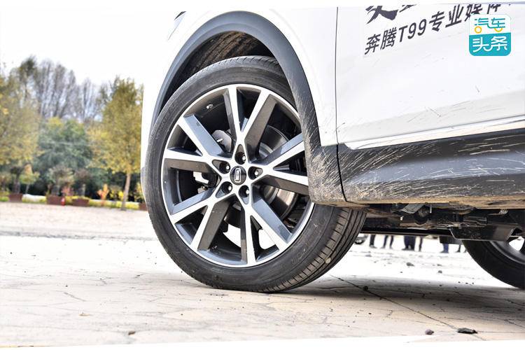 轮圈采用了双色10幅式设计,奔腾官方称T99的轮毂造型设计借鉴埃了菲尔铁塔的结构形式,通过大尺寸的轮毂配合削弱的轮辐特征,使得车型的下装呈现出轻盈的态势。此次试驾的高配车型轮胎规格为245/45 R21,上市后低配则将装备规格为245/50 R20的轮胎。