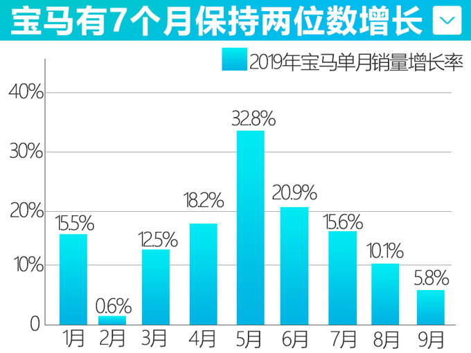 另外,值得注意的是9月份5.8%的增长率也创下了宝马今年以来的单月增速新低(2月份因春节因素除外),当前回归低速增长,也是宝马今年销售增量主力X3 (配置|询价)与去年同期销量对冲以及3系 (配置|询价)进入销量爬坡期后的正常市场现象。不过,随着近期宝马新车攻势(X5 2.0T车型/中期改款X1/国产X2等于9/10月上市)升级以及3系等最近半年内上市新车型的逐步爬坡,宝马有望进入新一轮的市场增长周期。