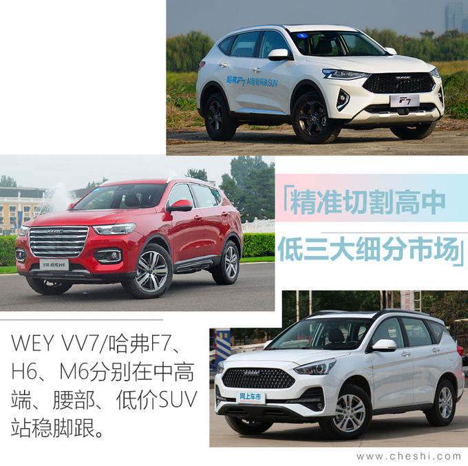 而从长城车型销量结构看,以M6、H6、F7/VV6为代表的车型让长城分别分别在低端、腰部、中高端SUV三大细分市场站稳脚步。这种精准切割细分市场、相对稳健的产品布局将让长城在后续相当长时间内在20万元以下SUV市场保持绝对话语权,这一产品结构也是主要竞争对手吉利有所缺失的。