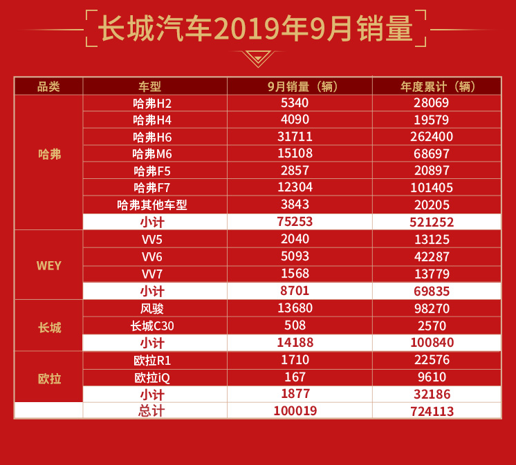 又逢一年“金九银十”,有人欢喜有人忧,十一小长假刚过,各个车企纷纷公布“金九”的销量。就在10月11日,长城汽车公布了2019年9月产销数据:长城汽车销量突破10万大关,共销售新车100019辆,环比大涨42.48%,同比增长15.33%。那么,是什么让长城汽车在车市低迷的大环境下还能逆势而上的呢?