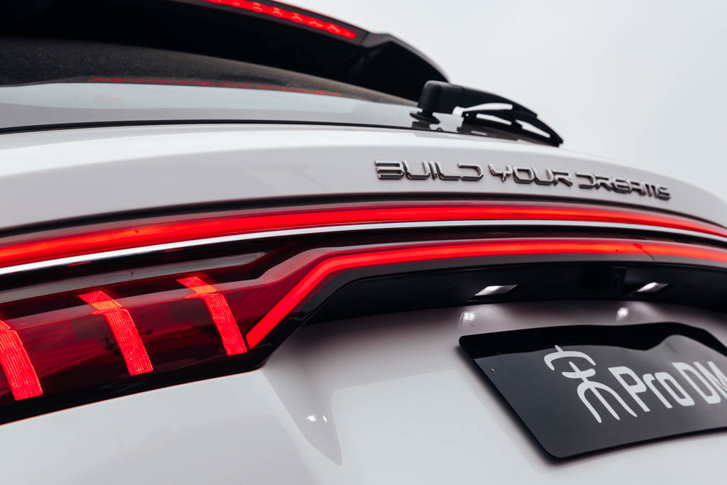 宋Pro DM的外观采用了全新的Dragon Face 2.0设计元素,在全新设计语言的影响下,使车头整体潮流感更浓厚、时尚,看起来也更年轻。中网标志性的“龙颜”格栅面积有所提升,粗壮的银色装饰条贯穿中间Logo,并向两侧延伸,使车头的整体性得到提升。前大灯组还采用了“龙爪”的设计元素,三颗LED光源的灯珠竖立在头灯组内,吃层次分明,炯炯有神。