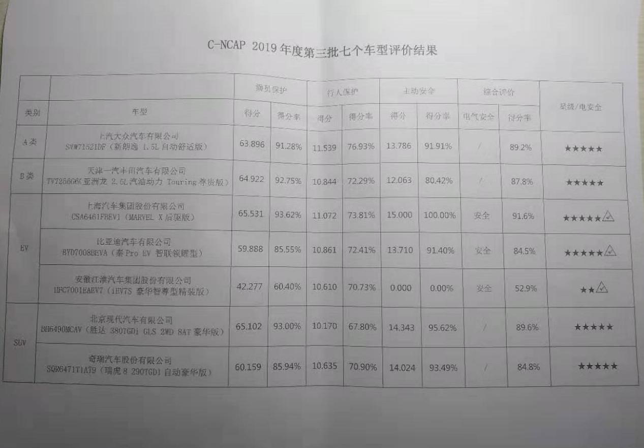 10月10日,2019年度C-NCAP第三批碰撞测试评价结果正式对外发布。参加本次碰撞测试的共有7款车型,分别是上汽大众新朗逸 (配置|询价)、一汽丰田亚洲龙、上汽荣威MARVELX、北京现代胜达 (配置|询价)、比亚迪秦ProEV、江淮iEV7S和奇瑞瑞虎8。