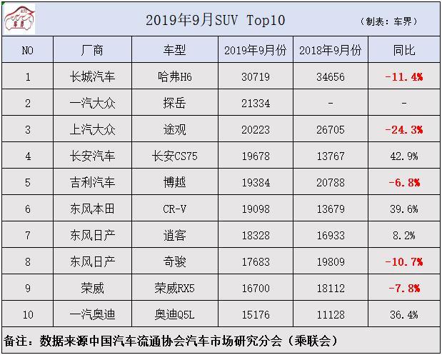 9月的轿车板块形式大9月SUV销量TOP10来了,大众双雄进前三,长安CS75小胜博越好,多款车型实现爆发式增长,然而SUV领域就没有那么好运了,哈弗H6 (配置|询价)虽然是销冠,不过同比下滑11.4%,大众的神车途观 (配置|询价)也下滑了24.3%,而博越、奇骏、荣威RX5等车型相继下滑。其他的SUV车型则表现较为优秀,上涨幅度巨大,具体让我们一起来看看吧。