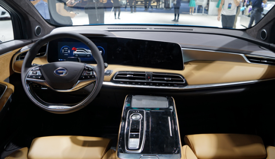 广汽新能源Aion LX的内饰采用类似于奔驰S级的设计,其选用了两幅式方向盘并搭配一块曲面屏,其左面为仪表区域,右边为多媒体控制区域。中控台采用了双色的设计,用料方面也比较考究,采用缝线、钢琴烤漆以及皮质,在豪华中彰显出一丝年轻活泼的气息。